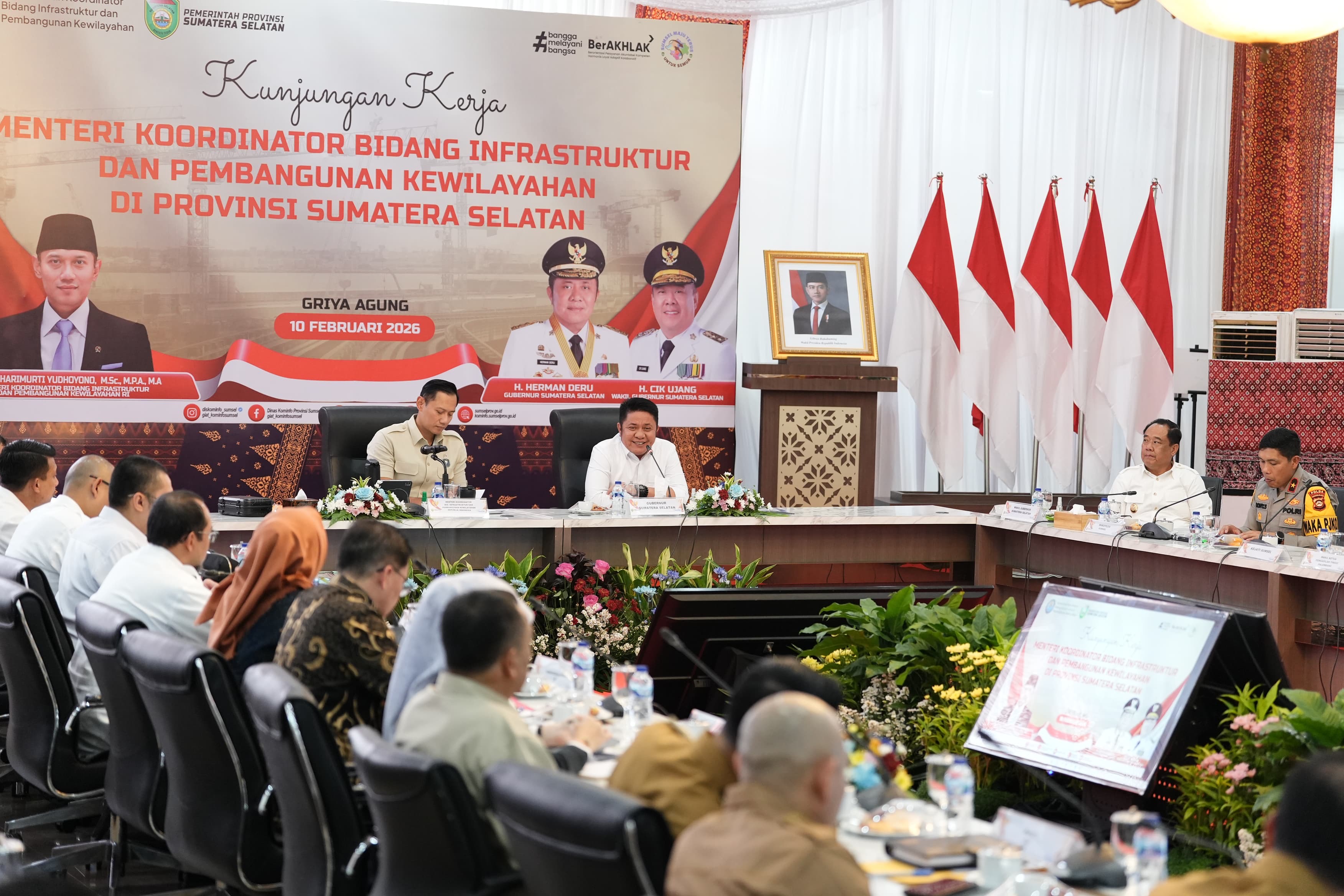 Palembang – Gubernur Sumsel H. Herman Deru didampingi Wagub Cik Ujang menyambut Menko Bidang Infrastruktur dan Pembangunan Kewilayahan RI, Agus Harimurti Yudhoyono (AHY), dalam Rakor Pelaksanaan Program Kerja TA 2026 di Griya Agung, Selasa (10/2/2026).