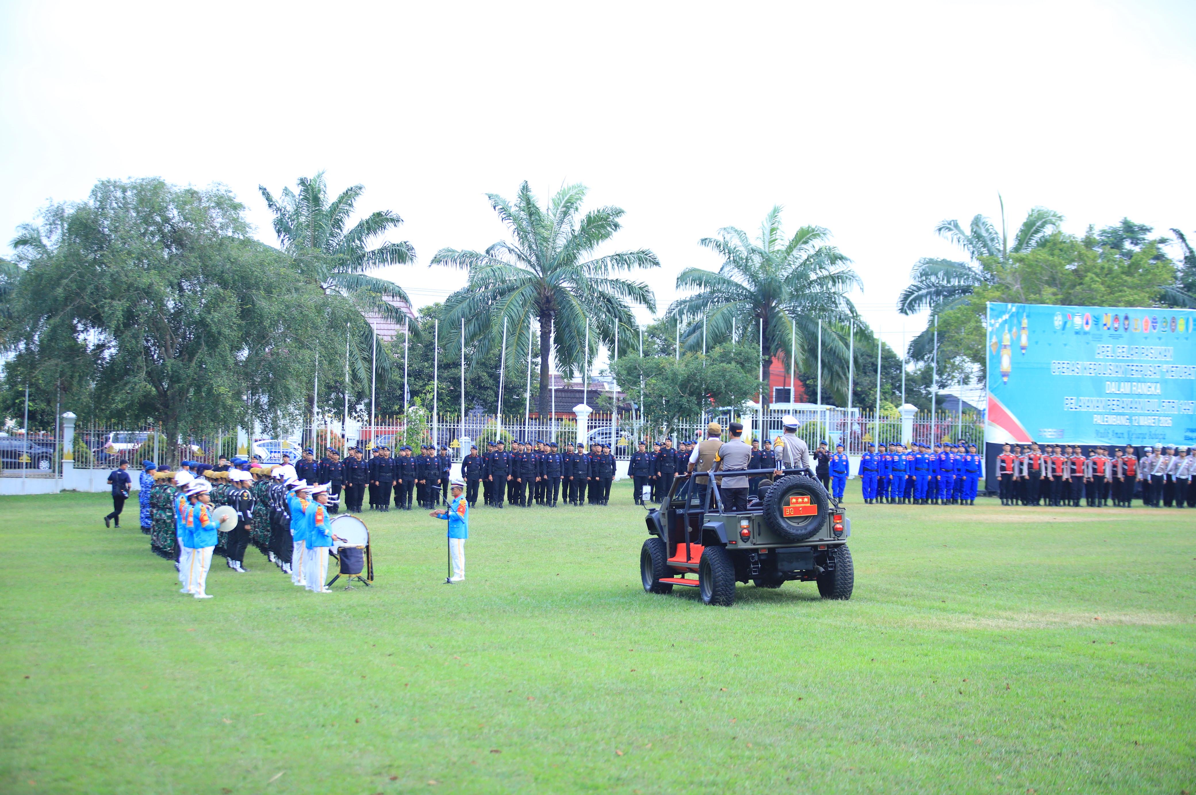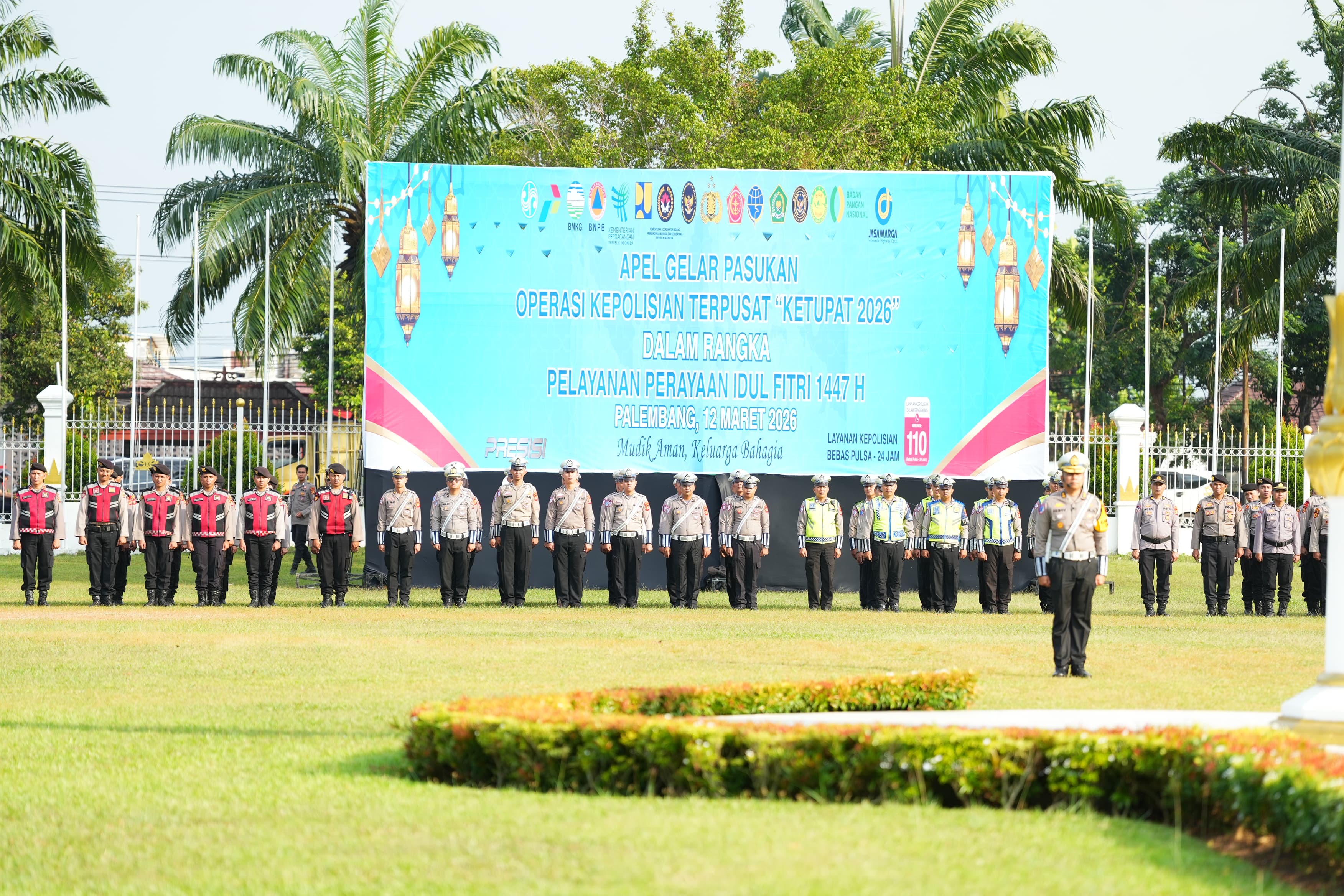 Apel diawali dengan pemeriksaan pasukan oleh Gubernur Sumsel didampingi Kapolda, disusul dengan penyematan pita tanda dimulainya Operasi Ketupat Musi 2026 kepada perwakilan personel TNI, Polri, dan Dinas Perhubungan.