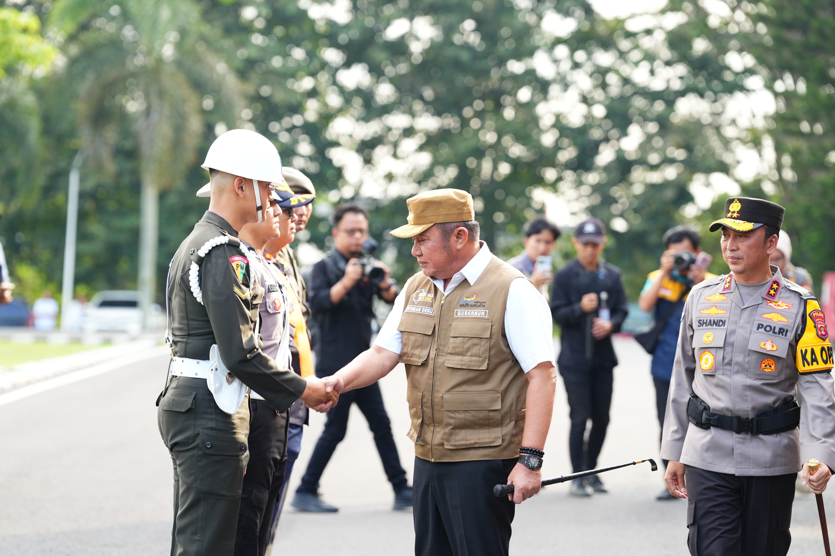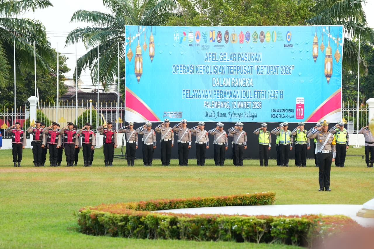 Palembang. Gubernur Sumatera Selatan, H. Herman Deru, memimpin langsung Apel Gelar Pasukan dalam rangka Kesiapan Pelaksanaan Operasi Ketupat Musi 2026. Kegiatan yang berlangsung di Halaman Griya Agung Palembang pada Kamis (12/3/2026) ini turut dihadiri oleh Kapolda Sumsel, Irjen. Pol. Dr. Sandi Nugroho, S.I.K., S.H., M.Hum., beserta unsur Forkopimda lainnya.