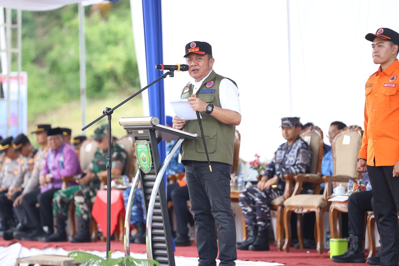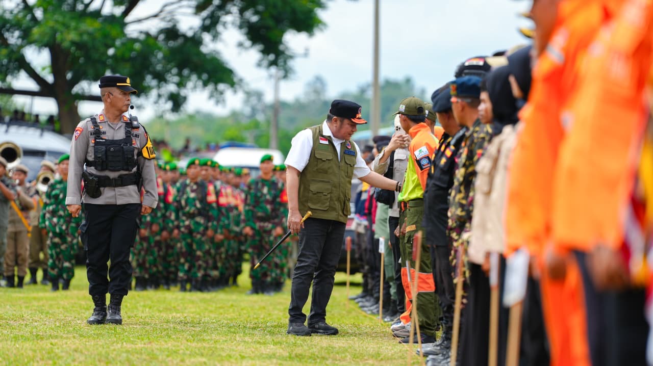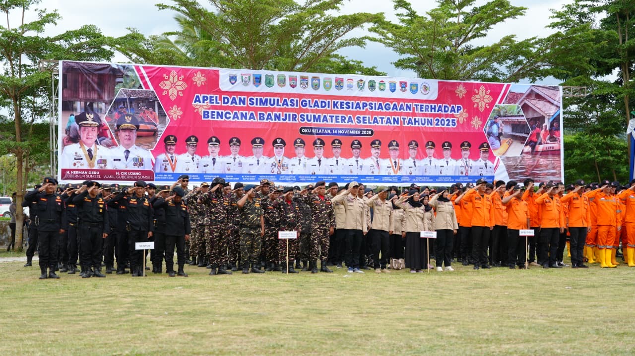 OKU Selatan. Gubernur Sumatera Selatan, H. Herman Deru, memimpin langsung Apel Gelar Pasukan dan Simulasi Banjir Provinsi Sumsel Tahun 2025. Kegiatan ini dilaksanakan di Lapangan AURI Banding Agung, Kabupaten OKU Selatan, pada Jumat (14/11/2025),dalam upaya mempersiapkan kesiapsiagaan personel menghadapi ancaman bencana hidrometeorologi pada musim hujan.