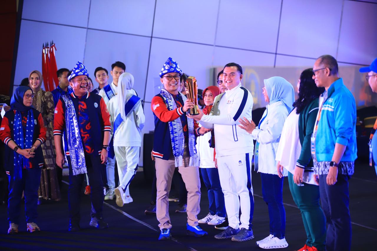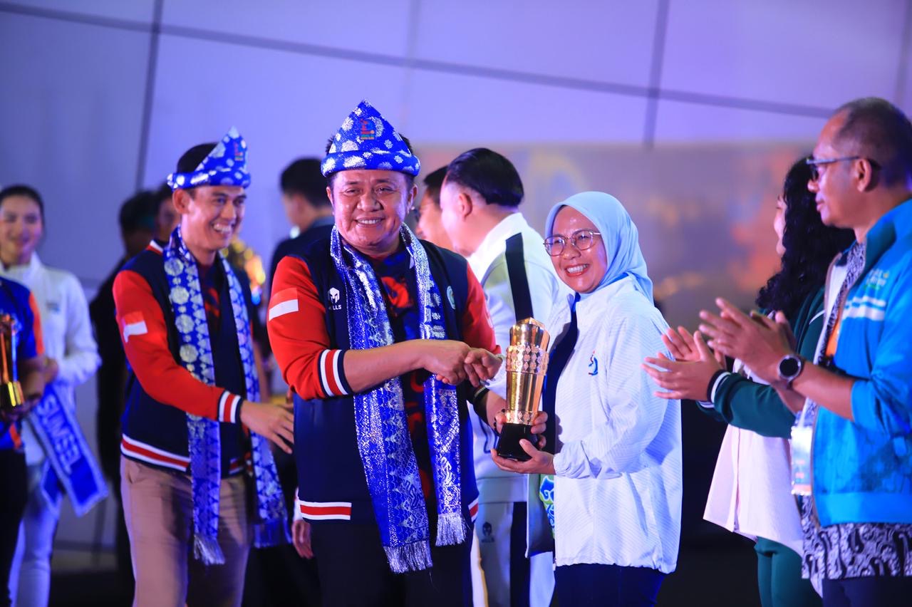 Gubernur Lampung, Rahmat Mirzani Djausal, S.T., M.M yang hadir bersama Forkopimda lainnya, secara resmi menerima tongkat estafet dan menyatakan kesiapan daerahnya untuk menjadi tuan rumah Pornas KORPRI berikutnya pada Tahun 2027.