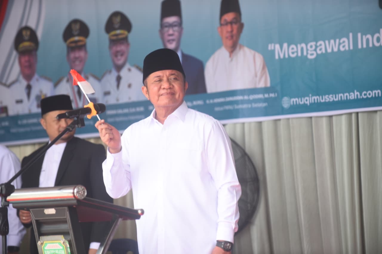 Banyuasin. Gubernur Sumatera Selatan H. Herman Deru menegaskan bahwa santri memiliki peran besar tidak hanya dalam sejarah perjuangan bangsa, tetapi juga dalam membangun peradaban masa depan. Hal tersebut disampaikannya saat menjadi Inspektur Upacara Puncak Hari Santri 2025 yang diselenggarakan di Kampus 3 Pondok Pesantren Muqimus Sunnah, bersama perwakilan pondok pesantren disekitaran Kota Palembang (Rabu, 22/10/2025)