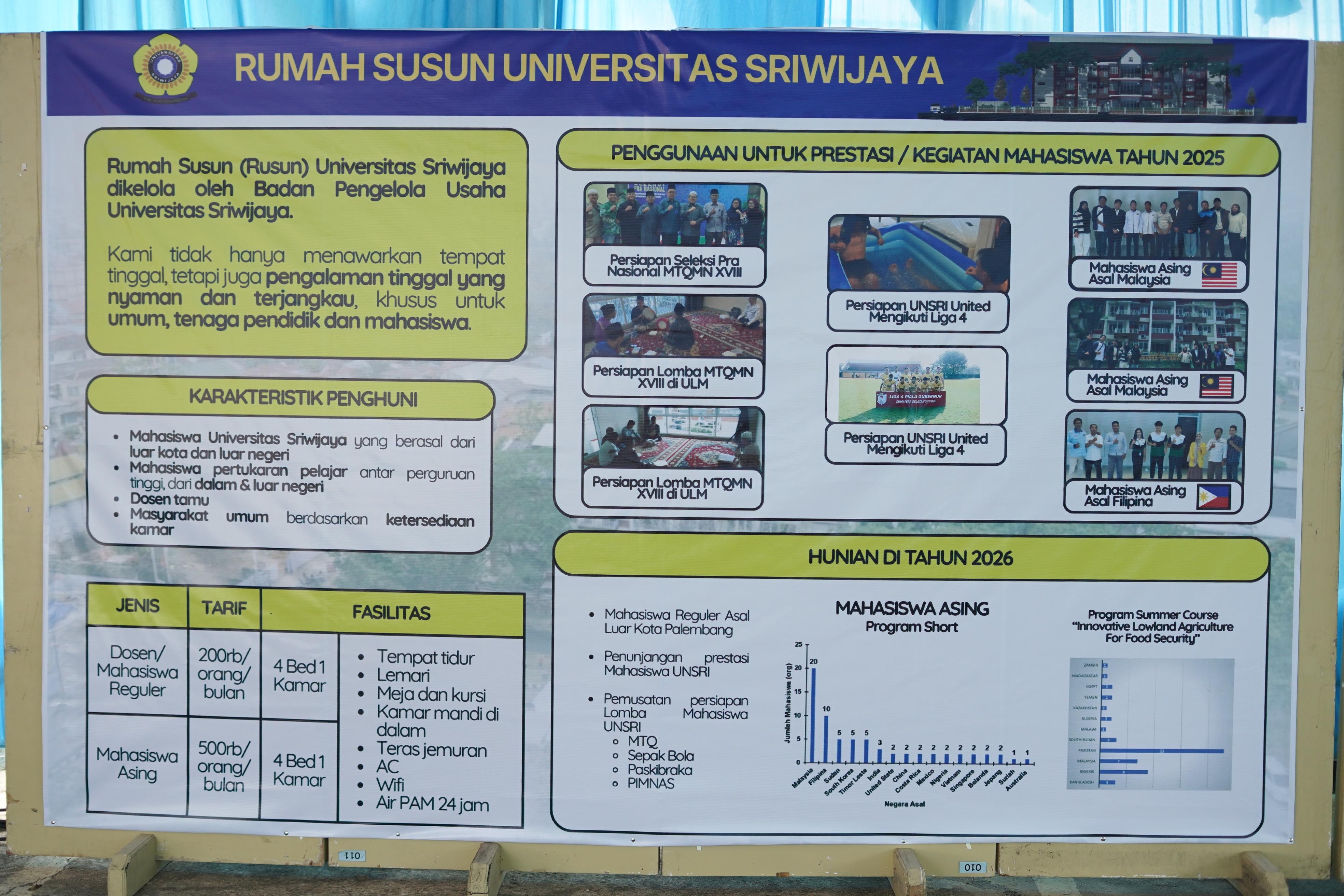 Rusun mahasiswa tersebut merupakan bantuan dari Kementerian Infrastruktur dan Pembangunan Kewilayahan yang diperuntukkan bagi mahasiswa penerima beasiswa serta mahasiswa dari luar negeri yang menempuh pendidikan di Universitas Sriwijaya. Kehadiran rusun ini diharapkan dapat menunjang kenyamanan hunian sekaligus mendukung proses belajar mahasiswa.