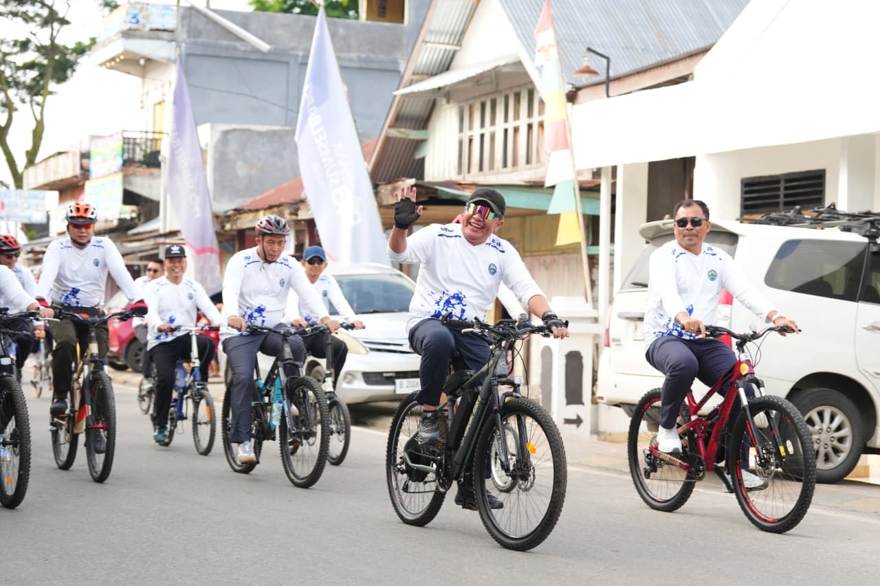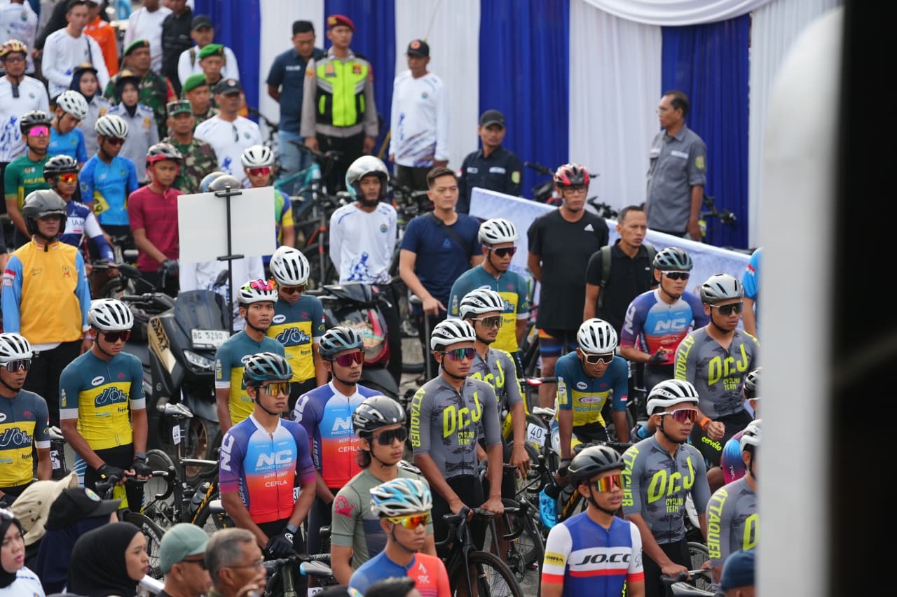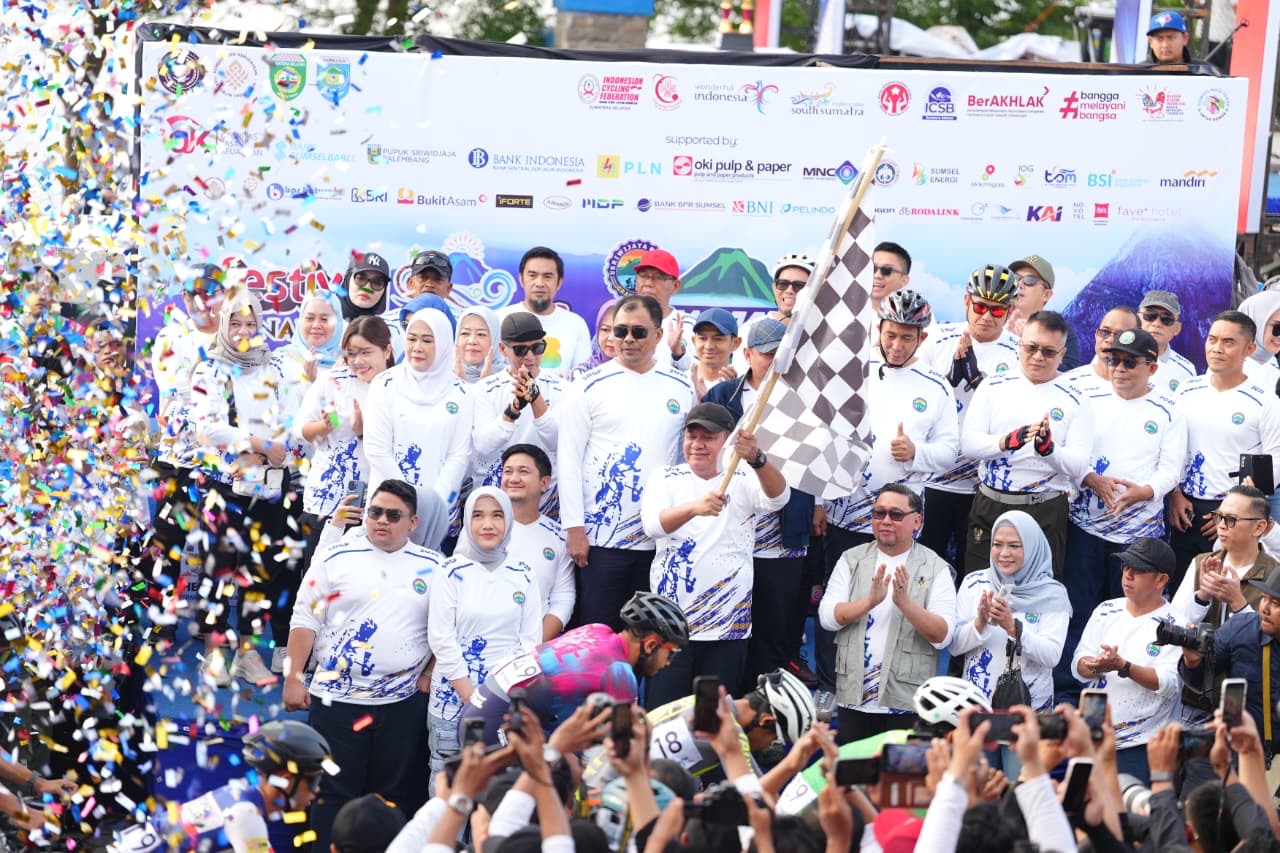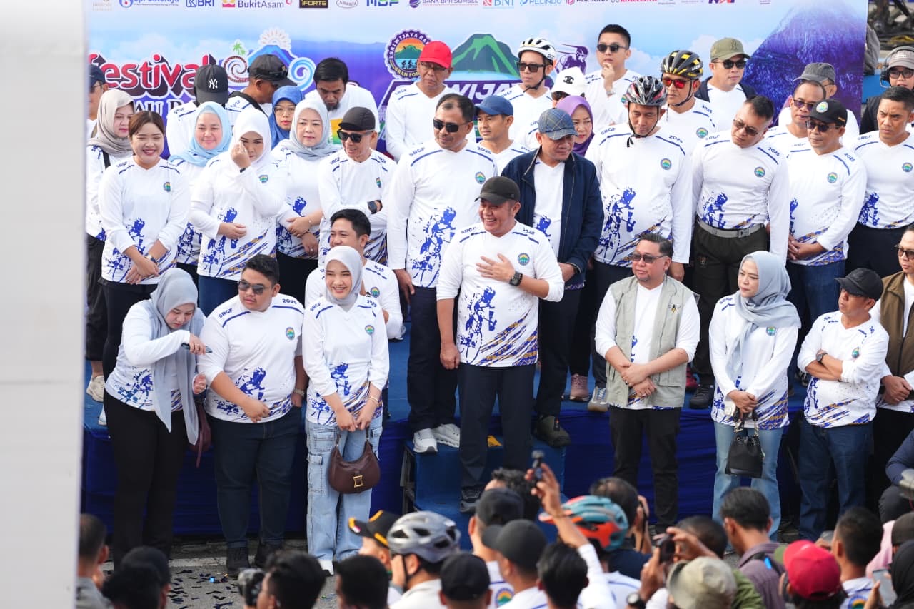 BANDING AGUNG - Gubernur Sumatera Selatan H. Herman Deru didampingi Bupati Ogan Komering Ulu Selatan Abusama, S.H., melepas 1.863 peserta Sriwijaya Ranau Gran Fondo (SRGF) Tahun 2025, Sabtu (15/11/2025). Bertempat di Plaza Icon Danau Ranau Kecamatan Banding Agung Kabupaten OKU Selatan.