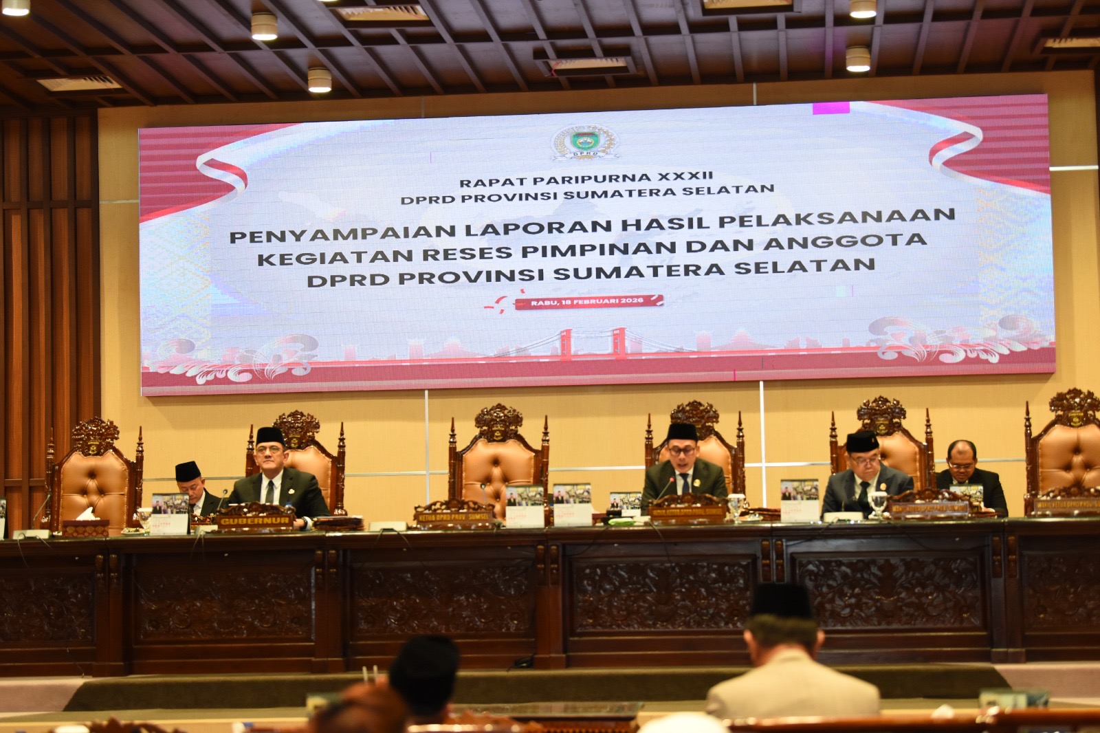 Sekretaris Daerah (Sekda) Provinsi Sumatera Selatan, H. Edward Candra, mengikuti Rapat Paripurna XXXII DPRD Provinsi Sumatera Selatan dengan agenda penyampaian Laporan Hasil Pelaksanaan Kegiatan Reses Pimpinan dan Anggota DPRD Provinsi Sumatera Selatan. Kegiatan tersebut berlangsung di Gedung DPRD Sumsel, Rabu (18/2/2026).